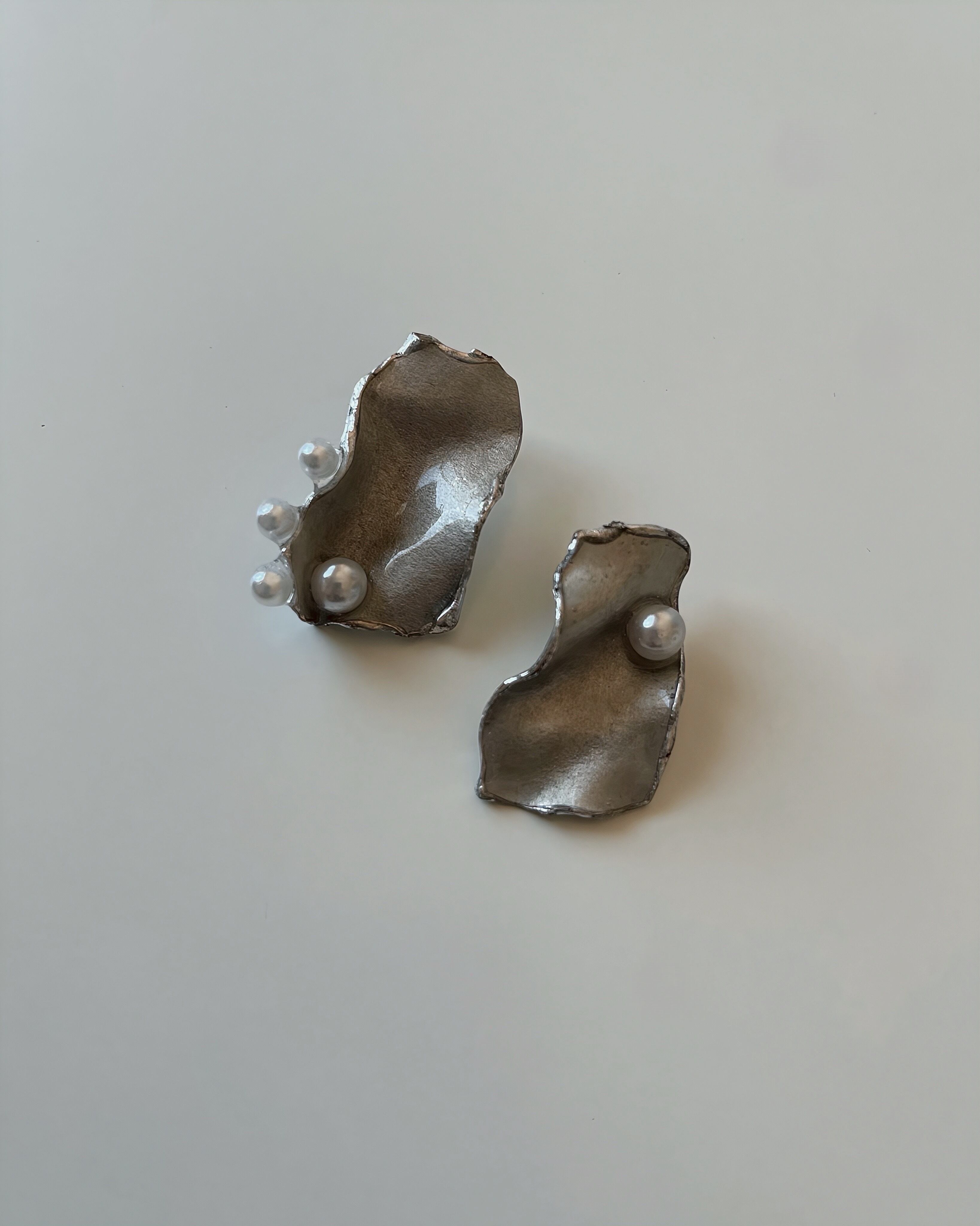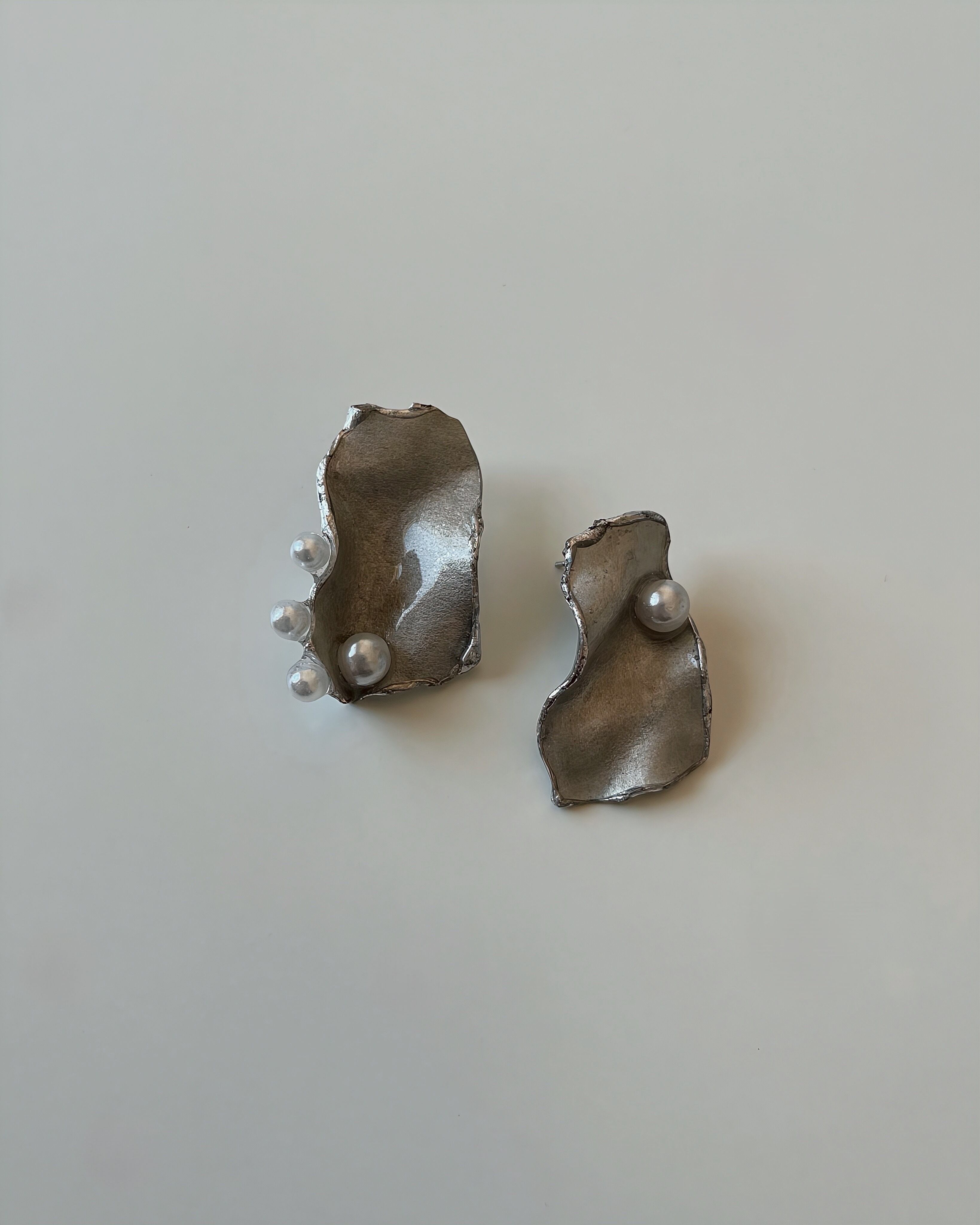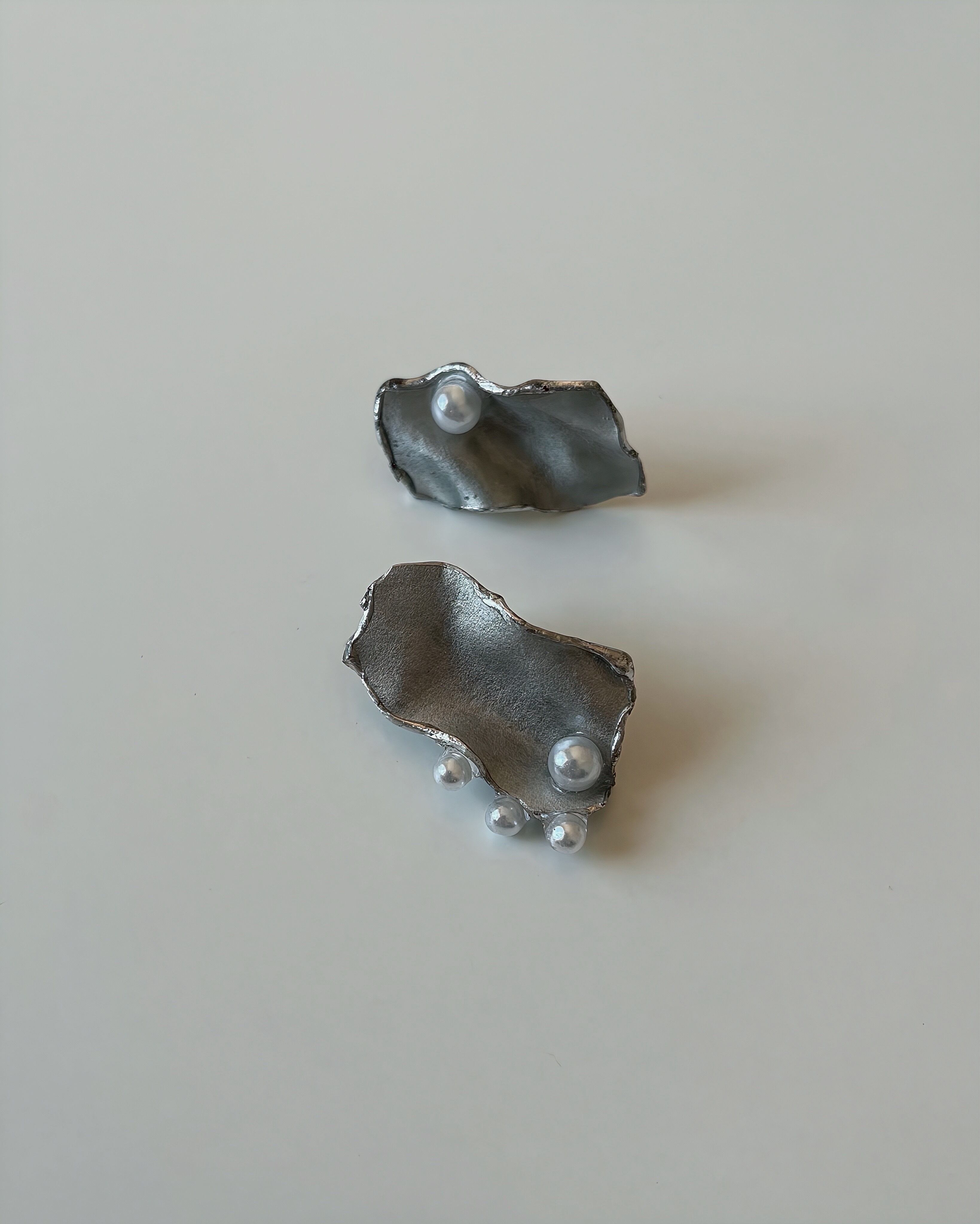 波打つような錫の表情に、静かに光を宿すパールを添えたアシンメトリーのデザインピアス〈錫波 – Suzunami〉。