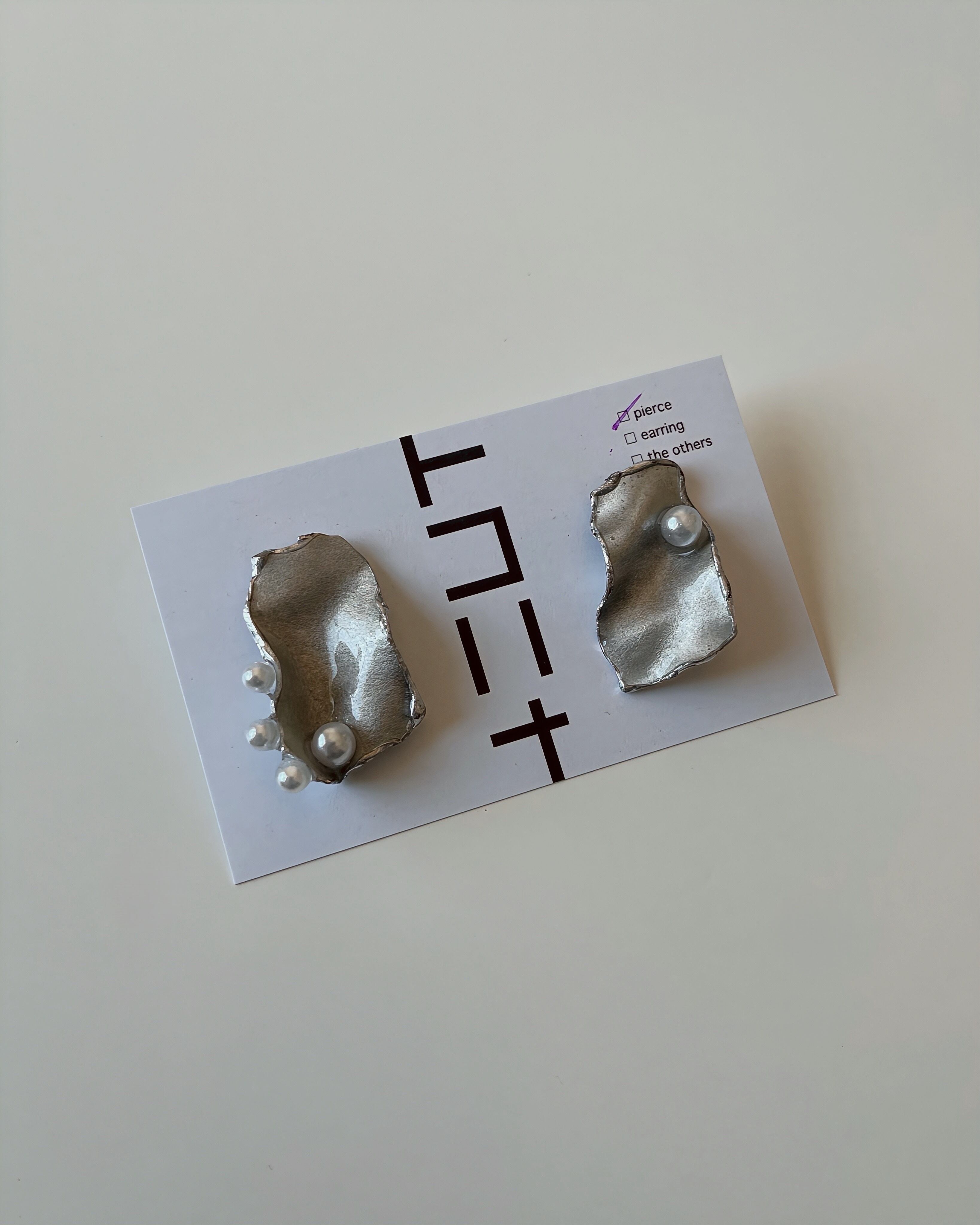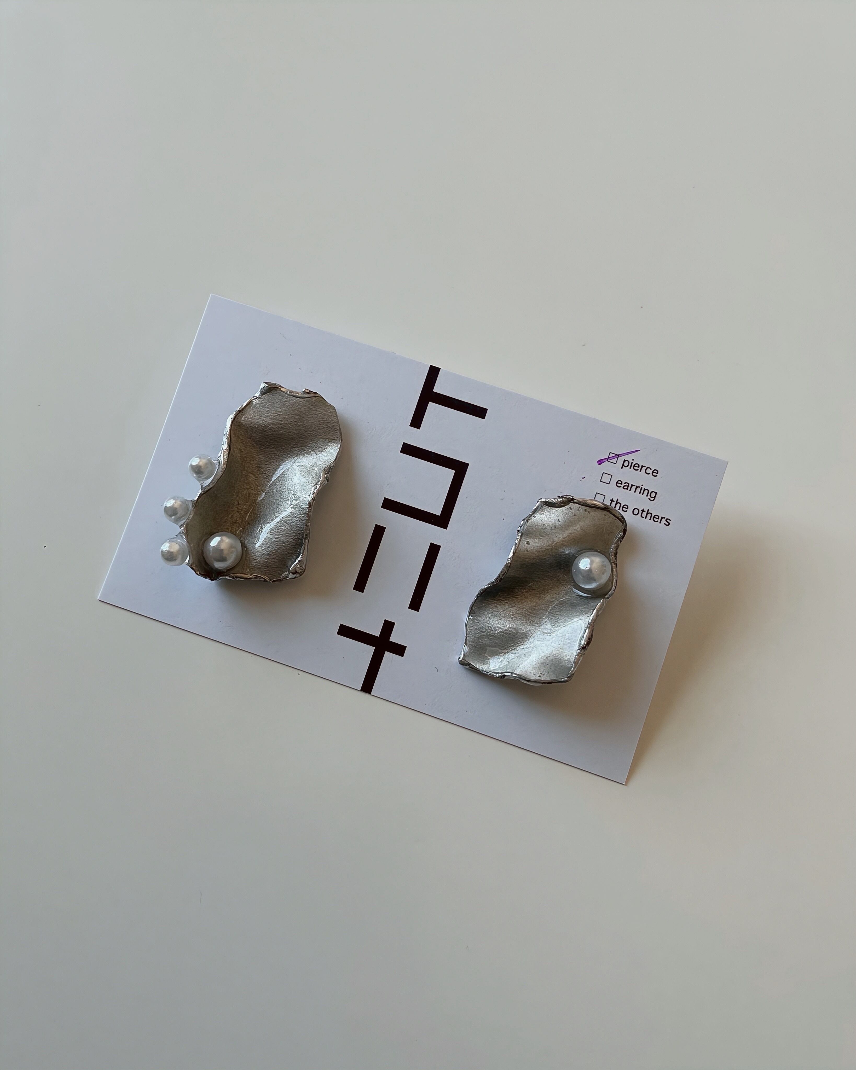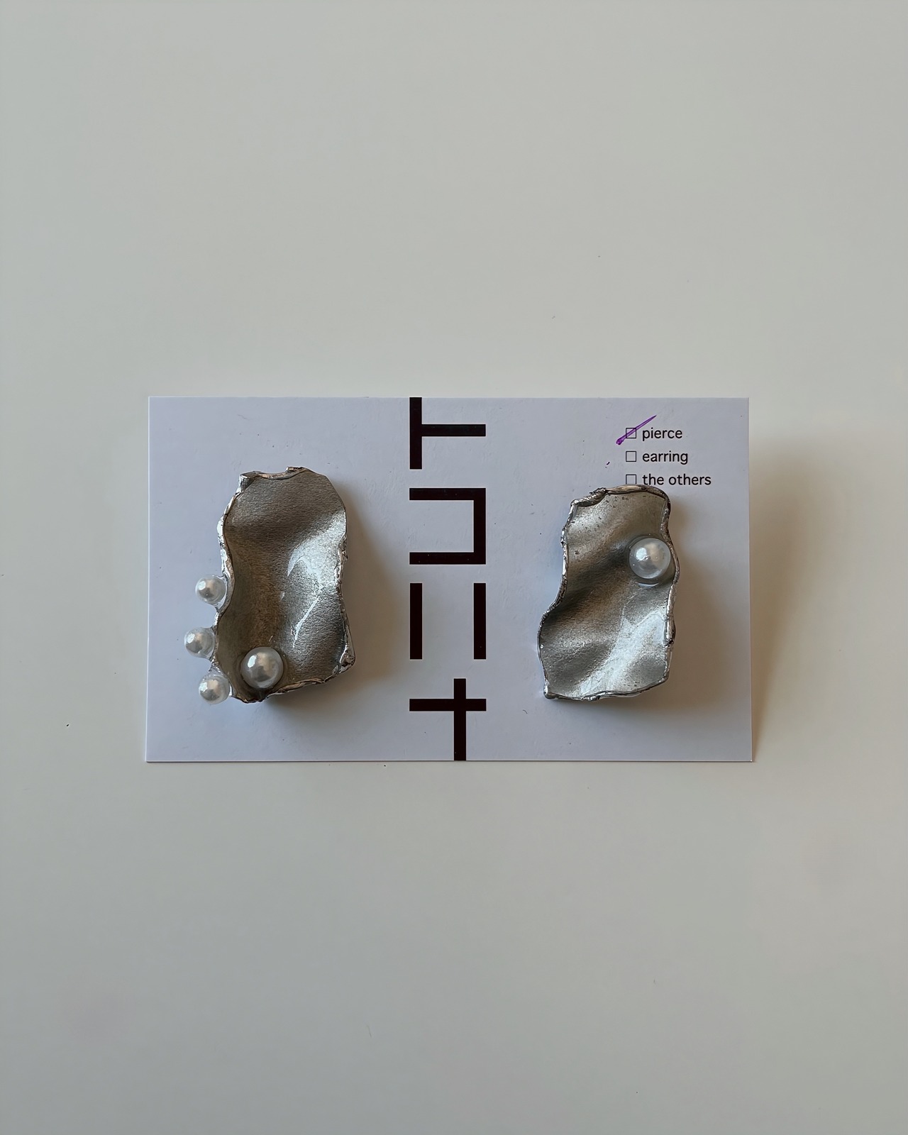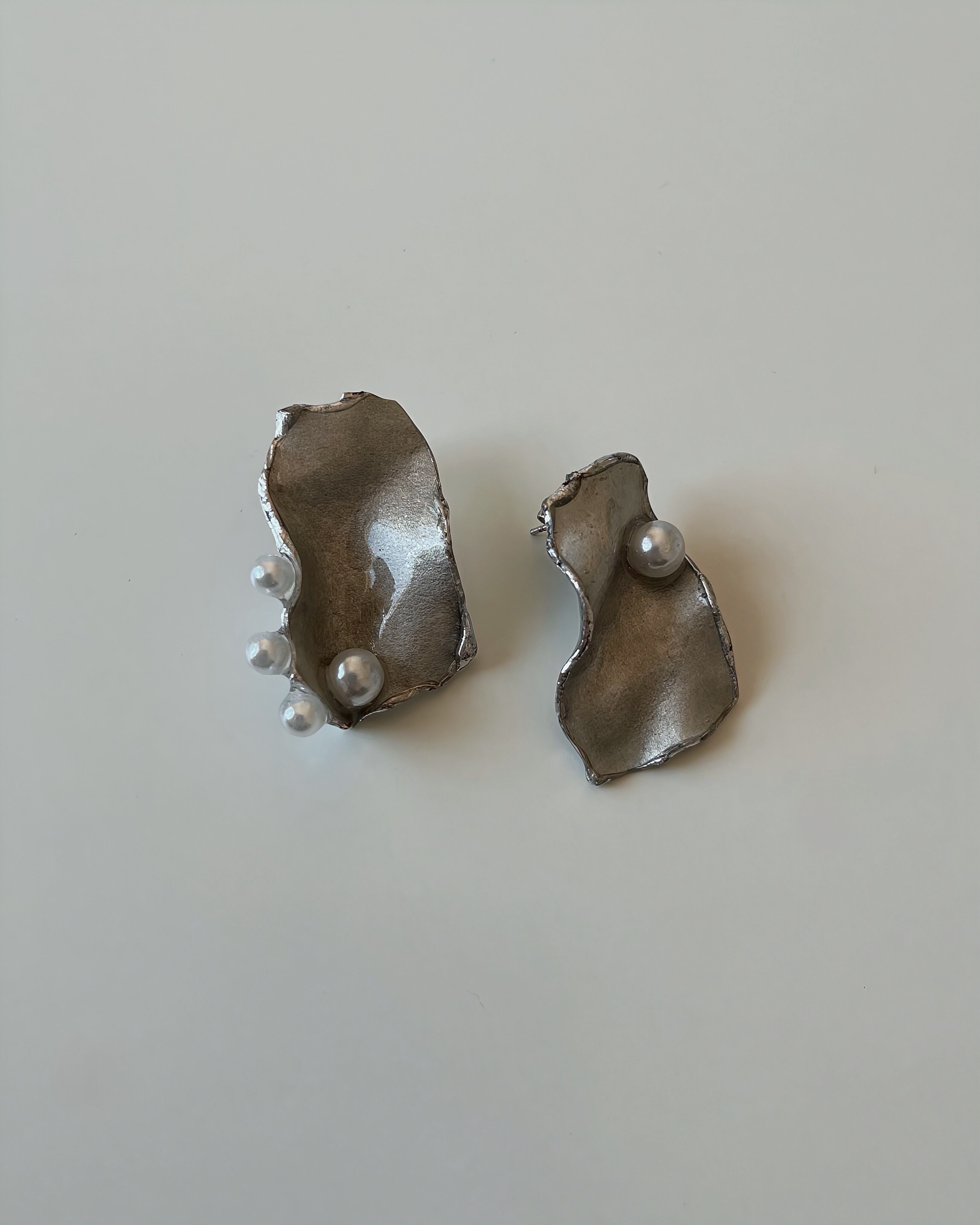 波打つような錫の表情に、静かに光を宿すパールを添えたアシンメトリーのデザインピアス〈錫波 – Suzunami〉。